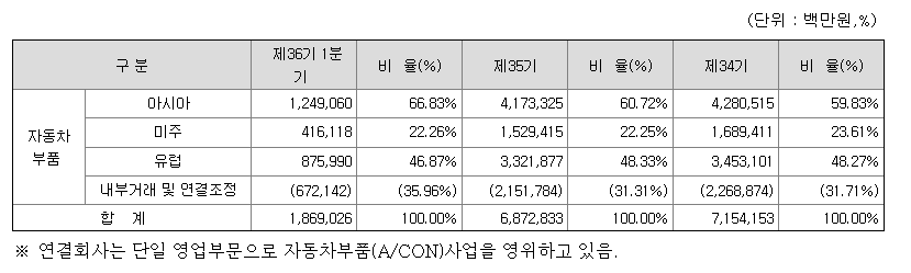 동사는 자동차의 열 관리 시스템을 생산하는 단일 사업부문을 영위하고 있음.