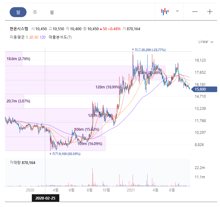자동차 부품 산업 관련주 한온시스템 주가 전망 분석 중 일봉차트입니다.