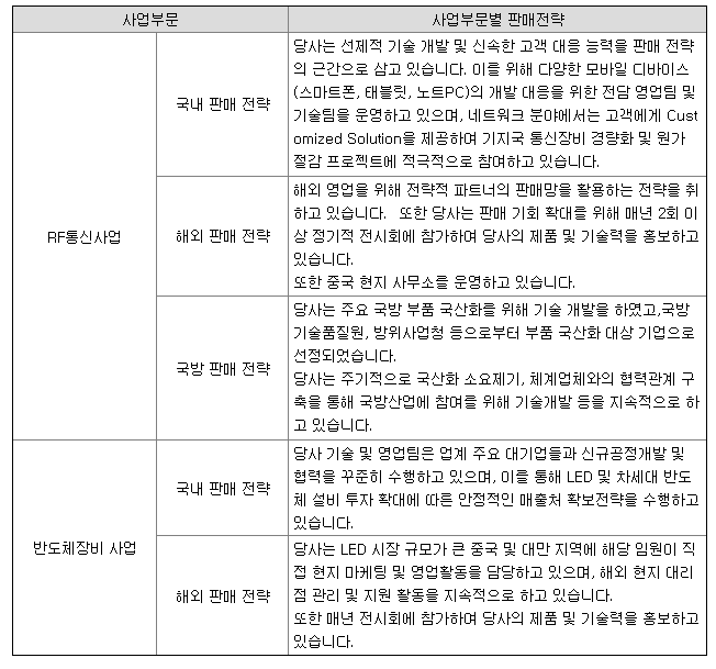 연결회사의 RF 제품의 전방 시장은 크게 이동통신 장비 시장(기지국 및 중계기 등), 모바일 기기 시장(스마트폰 등) 및 군수 시장(군수통신 및 항공)으로 나눌 수 있습니다.