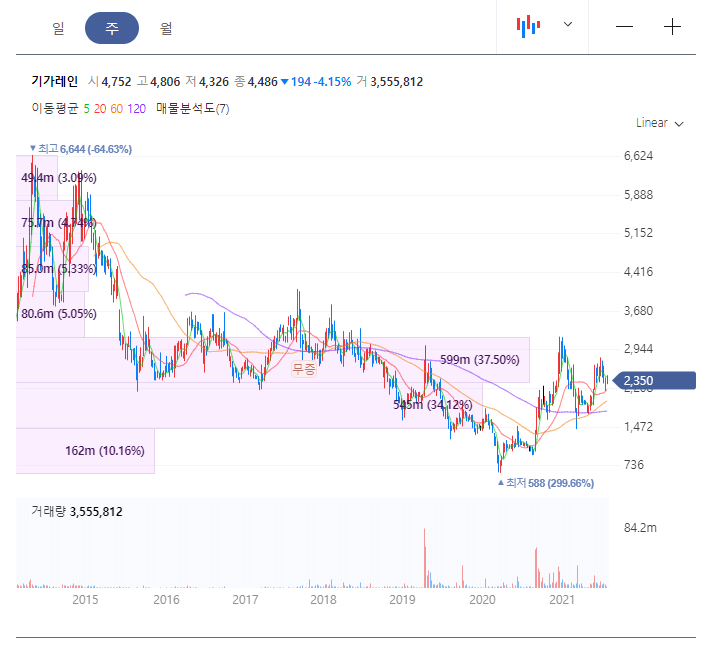 5g 관련주 기가레인 주가 전망 분석 중 주봉 차트입니다. 무상증자를 하였던 회사입니다.