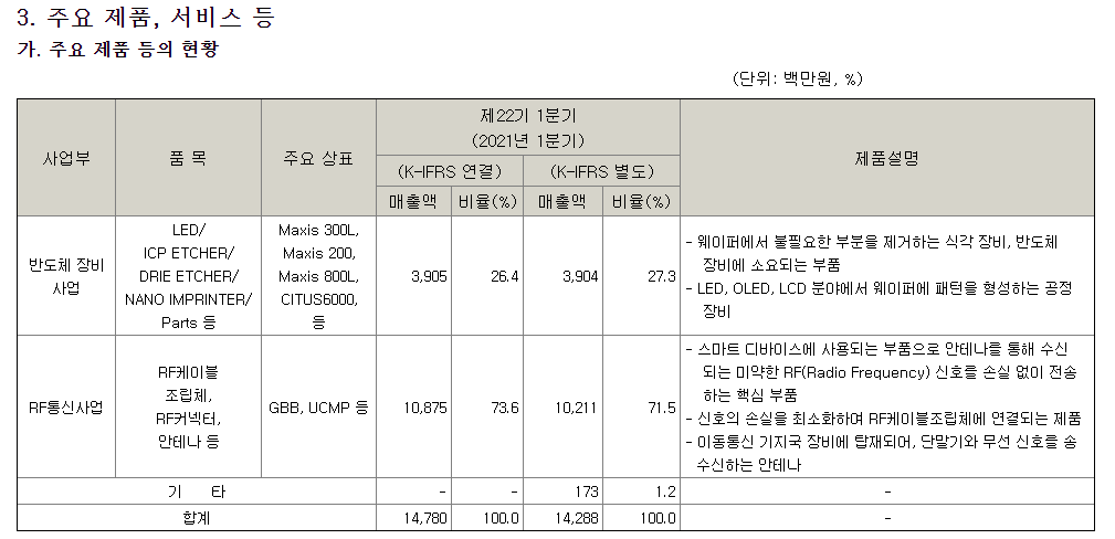 동사와 연결기업의 사업부문은 RF통신 사업, 반도체 장비 사업, 중고 반도체 장비 사업으로 구분.