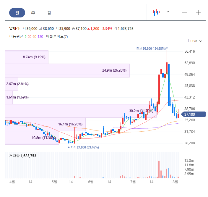인공지능 메타버스 관련주 알체라 주가 전망 분석 중 시가총액은 5,019억원이며 52주최고가는 56,800원입니다.