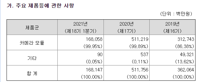 주요 생산 제품은 스마트폰/태블릿/노트북 카메라 모듈, 무선 데이터 모듈, 3D 깊이인식 카메라모듈로, 동사의 카메라 모듈 제품은 글로벌 카메라 고객사의 스마트폰, 태블릿, 노트북 등에 채용되고 있음.