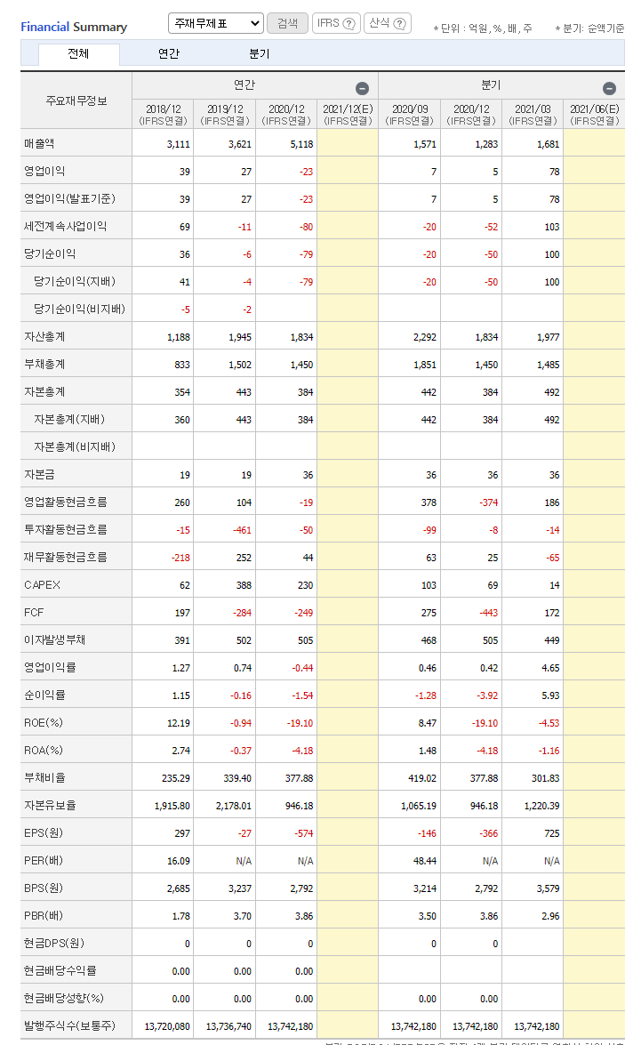 ROE -4.53, ROA -1.16 PER n/a PBR 2.96 입니다. 적자가 나는 기업에서 흔하게 볼 수 있는 마이너스, ROE입니다.