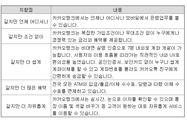 출범과 동시에 예적금, 신용대출, 비상금대출, 해외송금, 체크카드 등 누구나 편리하게 신청하고 사용할 수 있는 상품과 간편인증, 이체 및 ATM 이용수수료 무료 서비스 등 고객에게 편리함과 다양한 혜택을 제공하였고, 2018년 전월세보증금 대출, 26주적금, 내 신용정보 조회 서비스, 모임통장 서비스와 2019년 주식계좌 개설 서비스, 중신용대출, 저금통 등의 상품 및 서비스를 출시했습니다. 2020년에도 청년 전월세보증금대출, 제휴신용카드, 오픈뱅킹서비스, 햇살론, 26주적금 with 제휴사, 카카오뱅크 mini를 출시하며 지속적인 혁신을 추구해왔습니다.