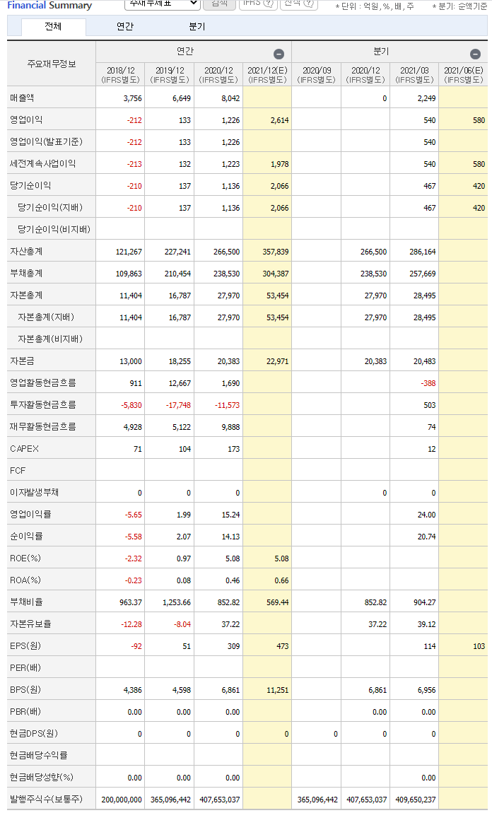 영업이익은 20년도 1분기보다 많이 상승 하였습니다. 앞으로 성장성이 기대가 됩니다. 19년 총 영업이익보다 매우 큰 폭으로 상승 하였습니다.