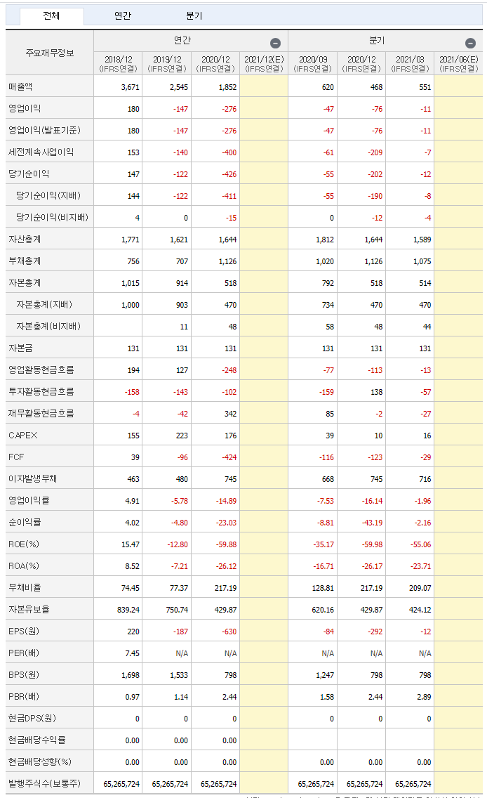 마이너스가 많은 기업이네요. 부채비율도 많이 증가 하고 있습니다.