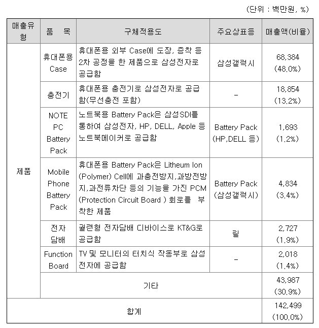 동사는 휴대폰 부품인 Battery Pack, Case(플라스틱 및 메탈), 충전기를 생산하여 글로벌 휴대폰 업체에 공급하고 있음.