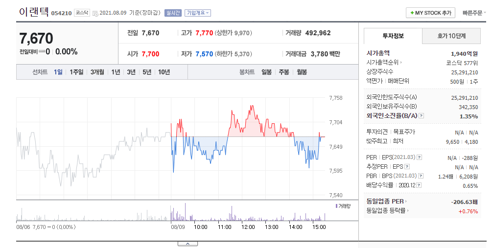 메타버스 관련주 이랜텍 주가 전망 분석 중 시가총액은 1,940억원이며 52주 최고가는 9,650원입니다.