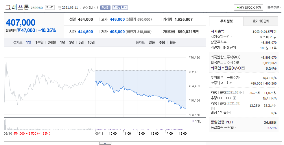 공모주 게임 관련주 크래프톤 주가 전망 분석 중 시가총액은 19조 9,015억원이며 52주최고가는 상장가였던 480,000원입니다.