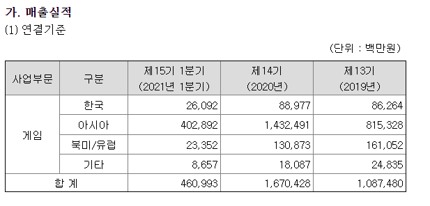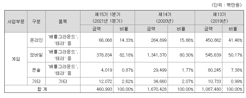 당사는 게임의 개발 및 퍼블리싱을 주사업으로 영위하는 글로벌 게임회사로, 당사의 첫 개발 타이틀이자 국내 MMORPG 최초로 글로벌 시장에서 인정받은 '테라', 당사의 대표 게임 타이틀로서 전세계 200개국 이상에서 서비스되고 있는 '배틀그라운드', 2020년 12월 국내 출시 이후 올 하반기 북미, 유럽 시장에 출시 예정인 '엘리온'까지 다수의 글로벌 게임 IP를 확보하고 있습니다. 이러한 글로벌 전략의 성과로 인해 현재 당사의 매출 중 약 90%가 해외에서 발생되고 있으며, 전세계 권역에서 당사의 게임이 서비스되고 있습니다.