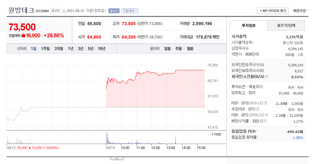 [특징주] 원방테크, 무상증자 소식에 이틀째 상한가 : 네이버 금융