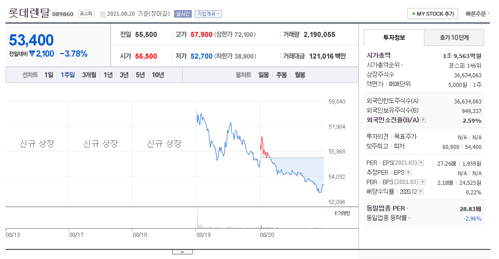 공모주 롯데렌탈 주가 전망 분석 중 시가총액은 1조 9,563억원이며 52주 최고가는 60,900원입니다.