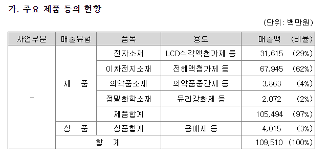 동사의 사업분야는 크게 전자소재(LCD식각액첨가제, OLED소재, 반도체공정 소재 등), 2차전지 소재(전해질, 전해액첨가제), 의약품 소재(의약품중간체), 정밀화학 소재임.