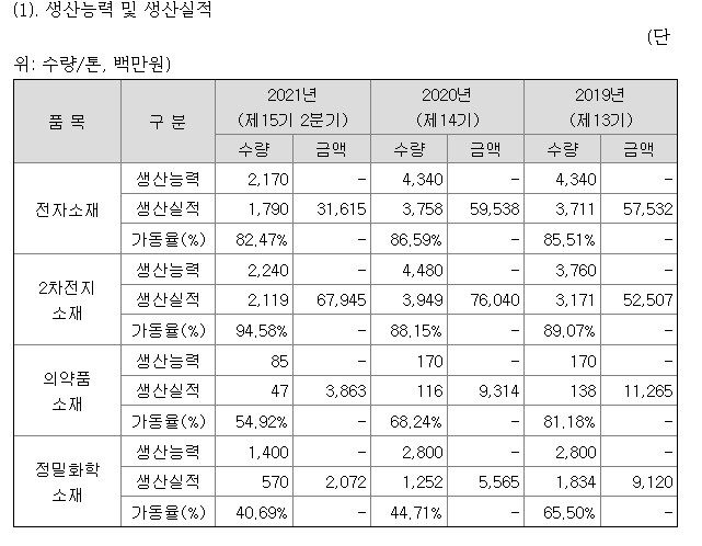 나) 당사는 2013년 2차전지소재 연구개발을 시작하여 SN, DPN 및 AN 등의 다양한 리튬 2차전지 전해액 첨가제를 생산하고 있으며, 2016년 말에 중대형 리튬전지용 전해질인 LiFSI를 세계 최초로 상용화 공장을 가동하였으며, 2018년부터 2020년까지 지속적으로 LiFSI, LiPO2F2 , LiBOB, LiDFOP 공장을 증설하여 왔습니다. 2021년 상반기에 LiPO2F2, LiBOB 신공장 준공이 완료되어 매출에 크게 기여할 것입니다.