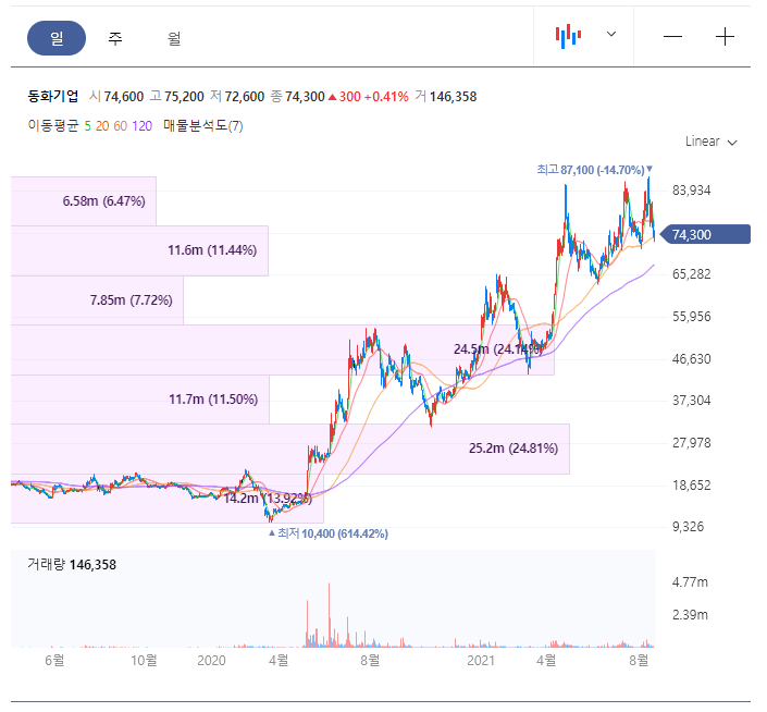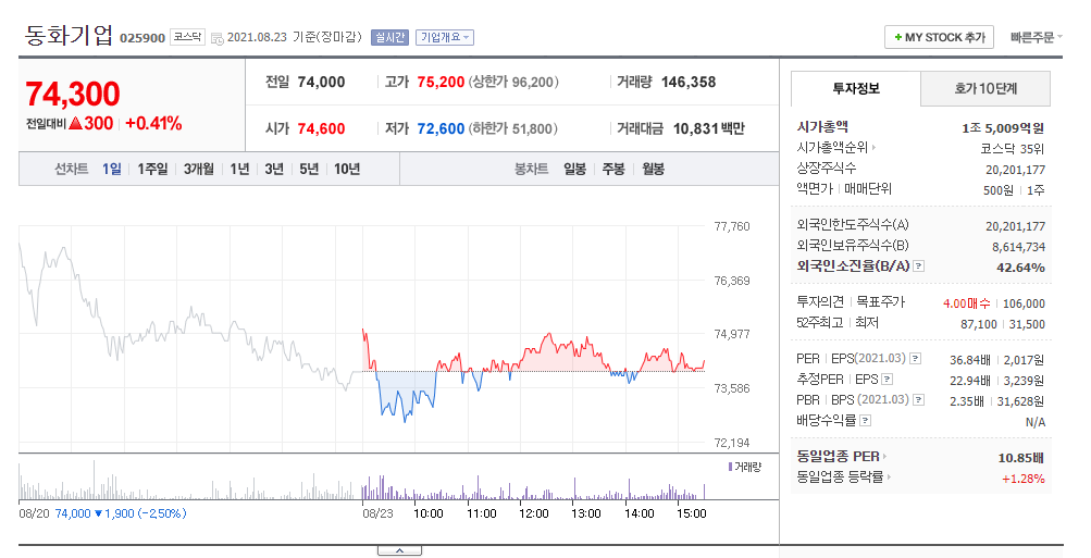 이차전지 전해질,전해액 관련주 동화기업 주가 전망 중 시가총액은 1조5009억원이며 52주 최고가는 87,100원입니다.