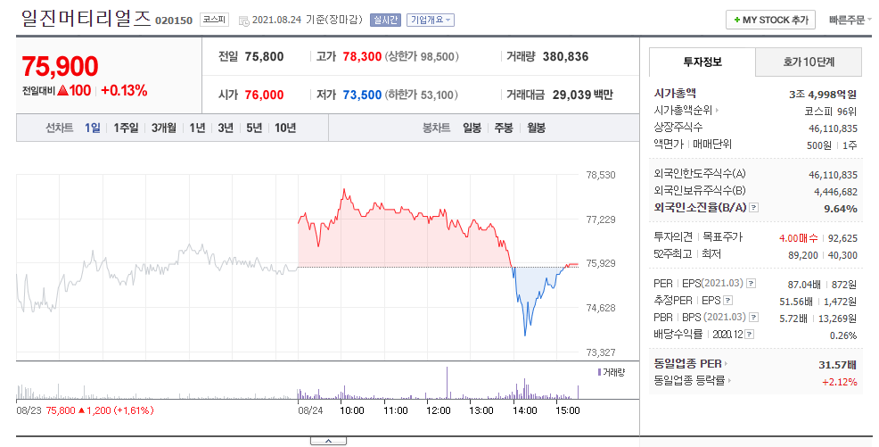 이차전지 동박 관련주 일진머티리얼즈 주가 전망 분석 중 시가총액은 3조 4,998억원이며 52주최고가는 89,200원입니다.