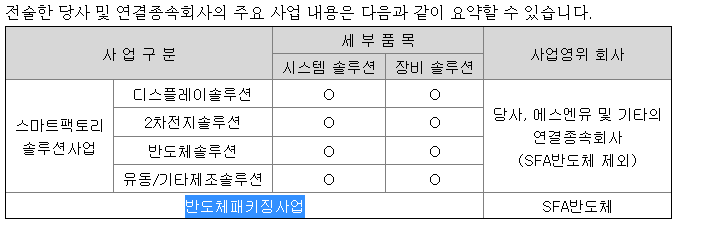 sfa반도체는 반도체패키징사업을 주로 맡아서 하며, 스마트팩토리솔루션사업은 에스에프에이에서 하고 있습니다.