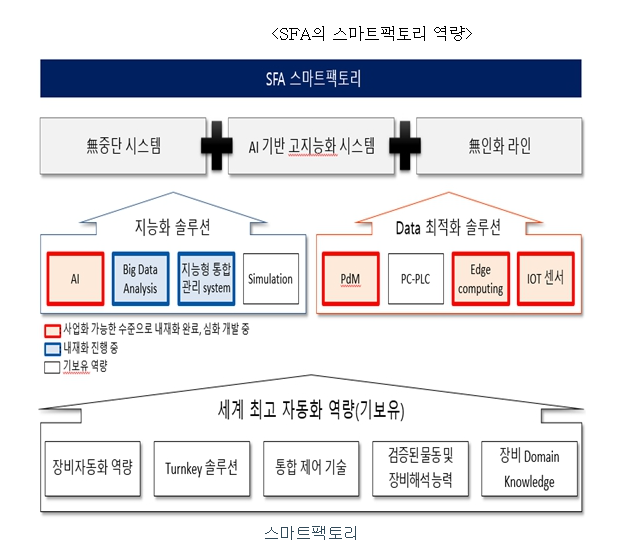 SFA는 인더스트리 4.0의 도래에 따른 각 산업의 사업 패러다임의 변화 속에 스마트팩토리 산업을 선도하기 위해 집중적 R&D 투자 실행하고 있습니다. 이를 통해 내재화한 스마트팩토리 요소기술들을 회사의 장비 및 생산라인 전체에 대한 경험과 지식에 접목시켜 차별화된 스마트팩토리 자동화 솔루션의 글로벌 리더로 성장하고 있습니다.