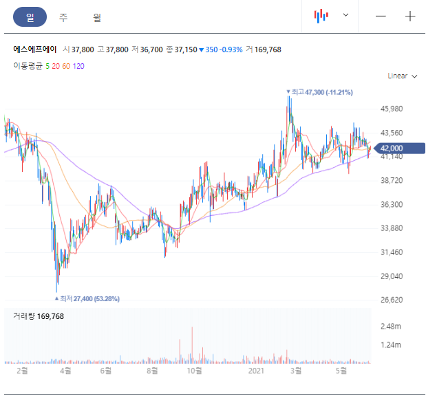 에스에프에이 OLED, 반도체,이차전지 스마트팩토리 관련주 주가 전망 분석 중 일봉 차트입니다. 코로나 이후에 계속 우상향 중으로 보입니다.