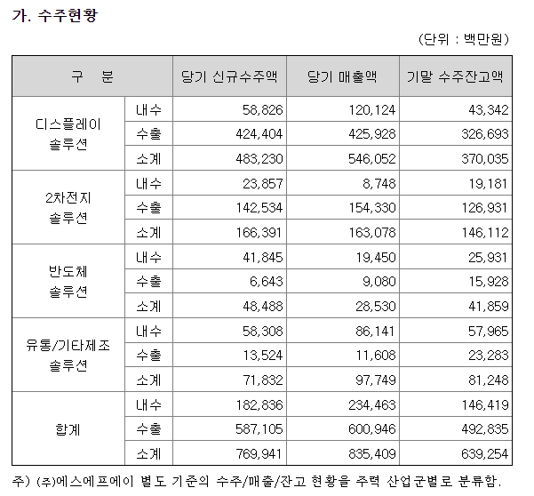 에스에프에이는 OLED(디스플레이) 전문 회사였기에 디스플레이 솔루션에 매출액이 높은걸로 보여지며, 2차 전지와 반도체도 수주가 잘 되고 있어보입니다.