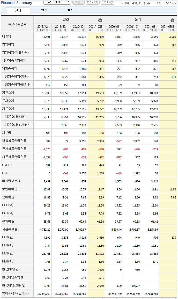 PER은 11.54, PBR값은 1.34 (PER 10 이하, PBR 2미만) 으로 준수해보입니다.