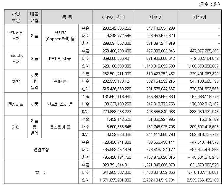 2차전지 음극집전체에 사용되는 동박 등을 생산하는 모빌리티 소재사업, 반도체 공정 소재를 생산하는 반도체 소재사업을 영위함.