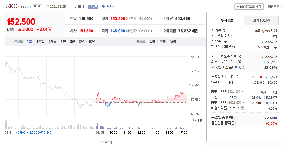 이차전지 동박 관련주 SKC 주가 전망 분석 중 시가총액은 5조 7,749억원이며 52주최고가는178,000원입니다.