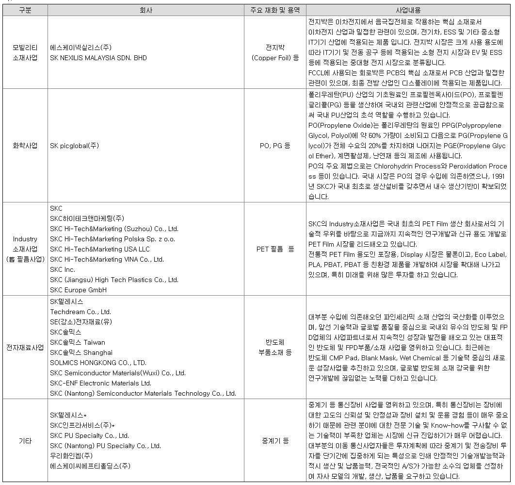 PET필름을 생산하는 Industry소재사업, 폴리우레탄의 원료인 PO 등을 생산하는 화학사업을 영위하고 있음. 주요 연결대상 종속회사로 SK넥실리스, SK피아이씨글로벌 등이 있음.