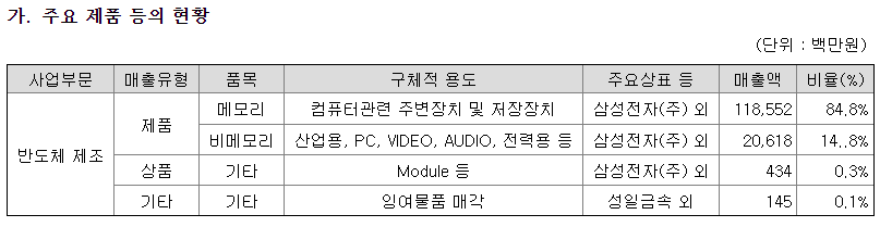 주요 제품을 보게 되면 메모리 반도체가 매출액이 84% 입니다. 메모리 와 비메모리 반도체의 매출액이 전부라고 보여집니다.