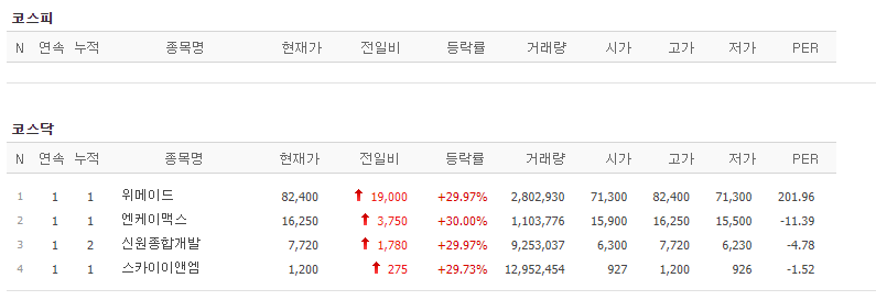 코스닥 : 위메이드, 엔케이맥스, 신원종합개발, 스카이앤엠