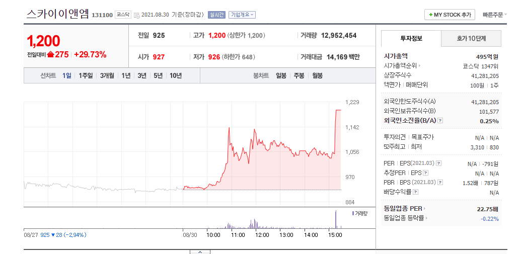 스카이이앤엠 (전환가액 가격 조정으로 인한 상한가)