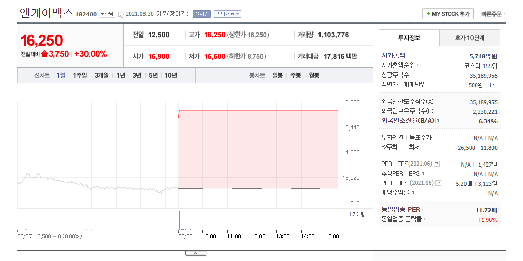 엔케이맥스 (슈퍼 엔케이 자동화 시설 개발로 인한 상한가)