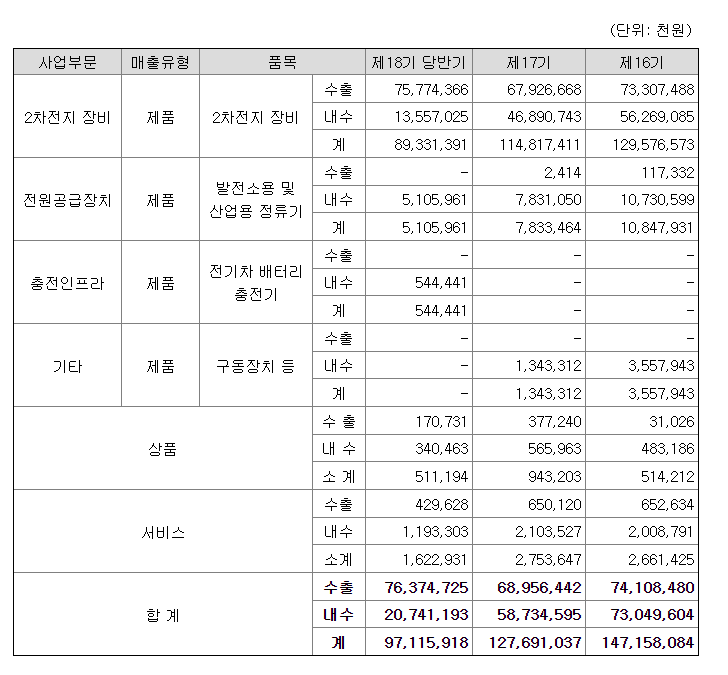 - 이차 전지 장비 : 포메이션 장비 등의 매출액 비율이 91.98%이며 피앤이솔루션의 매출액 상당부분입니다.