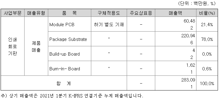 심텍에서 판매 내역의 매출액입니다. Module PCB, Package Substrate 가 매출액에 99.4%를 차지하고 있습니다.