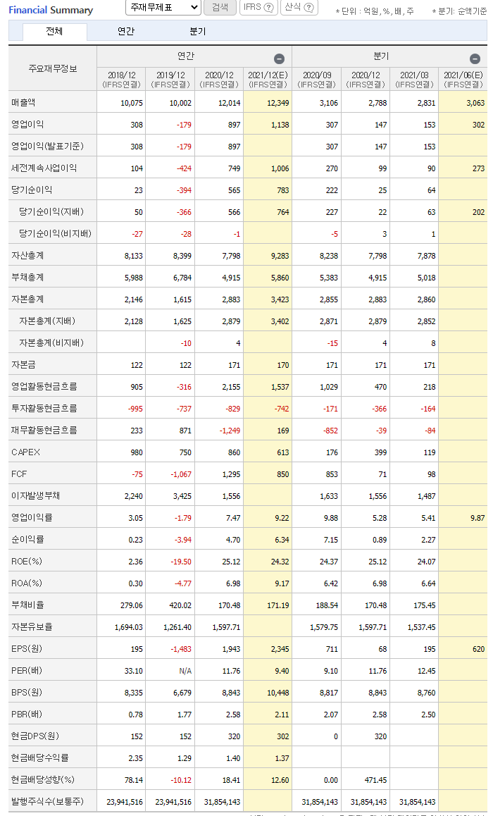 2019년도에 영업적자가 있었습니다. 유상증자를 한 이유가 있어 보이지만, 2020년 이후 영업이익이 급격하게 상승하고 있습니다.