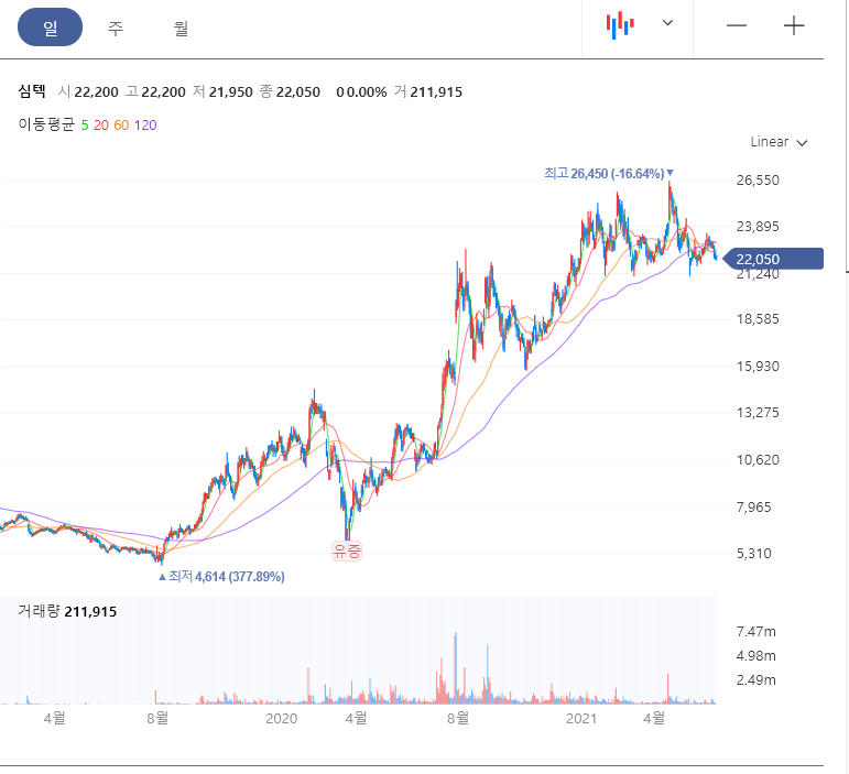 심텍 메모리 반도체 PCB 대장주 주가 전망 분석 중 일봉 차트입니다. 현재 22,200원에 거래 되고 있으며, 무서운 상승을 보여주고 있습니다. 2020년 4월에 유상증자를 하였고 5000원 정도였던 주식이 22000원에 거래되고 있습니다.