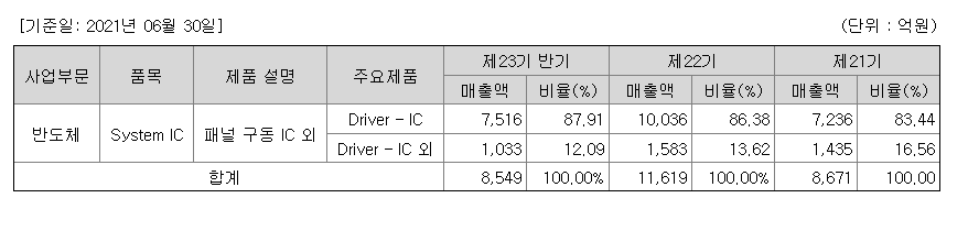 - Display Panel을 구동하는 핵심부품(System IC)을 생산, 판매하는 사업을 영위하고 있으며, Display 단일 사업 부문으로 구성되어있음.