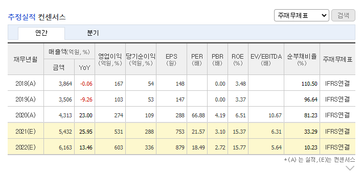 부채비율이 줄고 있는게 매우 고무적으로 보여지며, 20 ~ 21년엔 50%의 부채비율이 감소 된 수치를 예상 하고 있습니다.