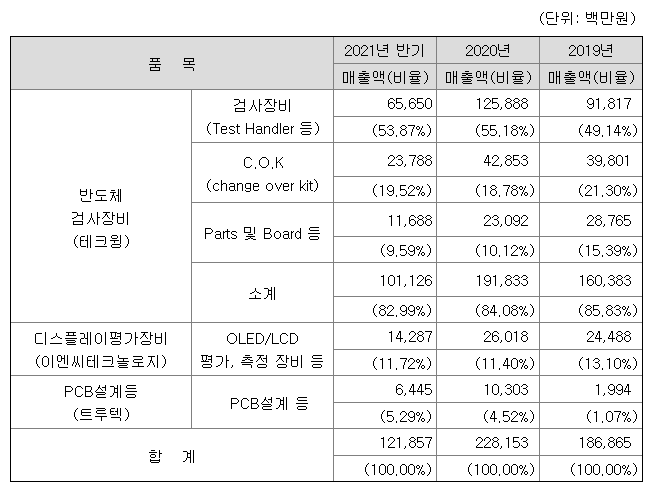 - 2021년 3월 기준 매출구성은 반도체 검사장비(테스트 핸들러, C.O.K 등)가 87.47%로 가장 큰 비중을 차지하고 있음.