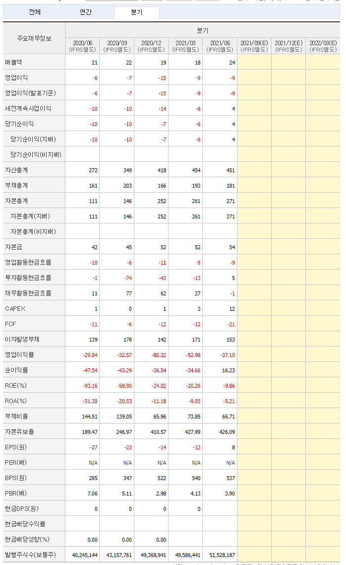 - ROE, ROA는 마이너스이며, PER N/A. PBR 3.9 EPS도 2분기 당기순이익이 흑자로 돌입하면서 +8원 되었습니다.