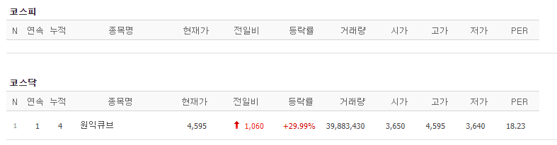 코스피에는 없고 코스닥에 1종목이 상한가를 기록하였습니다.