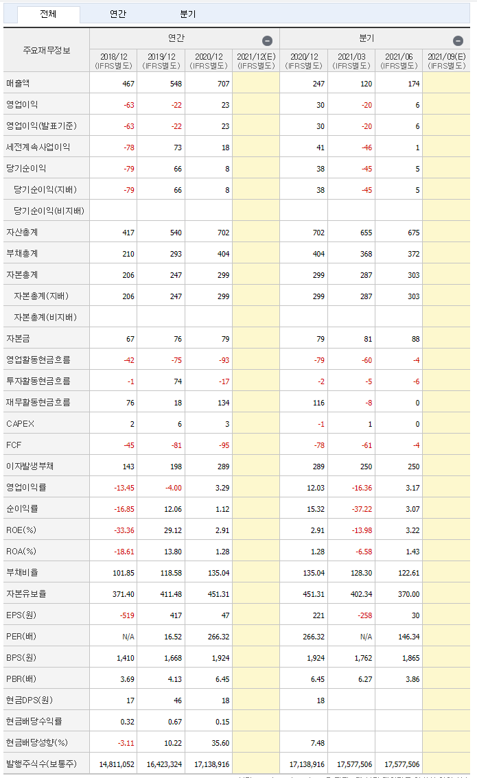 - 투자지표 : ROE 3.22, ROA 1.43, PER 146.34, PBR 3.86