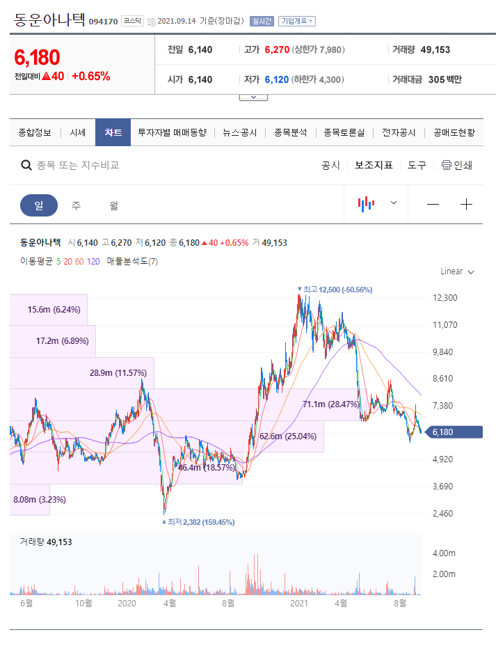 반도체 팹리스 관련주 동운아나텍 주가 전망 분석 중 일봉 차트입니다. 반도체 하락장에 큰 낙차로 하락하였습니다. 투자에 유의하시길 바랍니다.