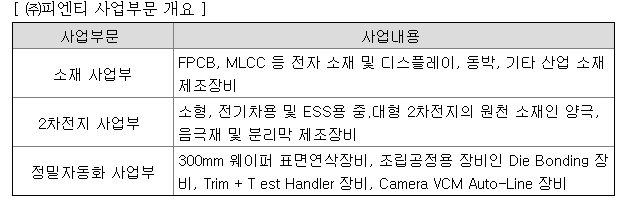 2차전지, 반도체 등 소재 관련주 피엔티 주가 전망 분석 중 사업부분입니다. 소재는 삼성전기 주력 상품인 MLCC, 2차전지 사업부에는 ESS, 2차전지 등 다양한 소재를 취급 하고 있습니다. 반도체 디스플레이어 2차전지 등 다양하게 취급하고 있으며 무상증자까지 했던 회사입니다. 자본이 많을 것으로 예상 됩니다.