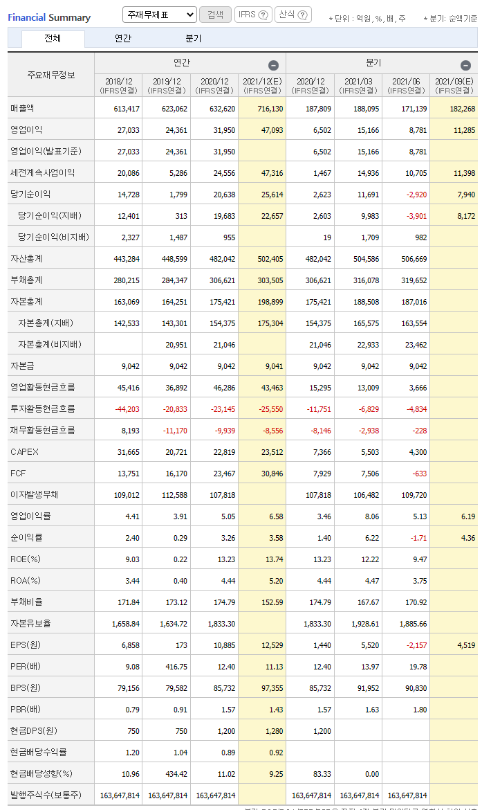 - 투자지표는 : ROE 13.74, ROA, 5.20, PER 11.13, PBR 1.43입니다. 투자 지표상은 상당히 좋네요.