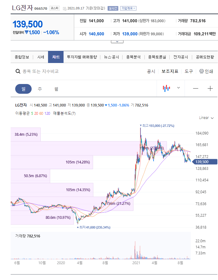 LG전자 주가 전망 분석 중 일봉 차트입니다. 2021년도 이후에 급 상승을 하였습니다.