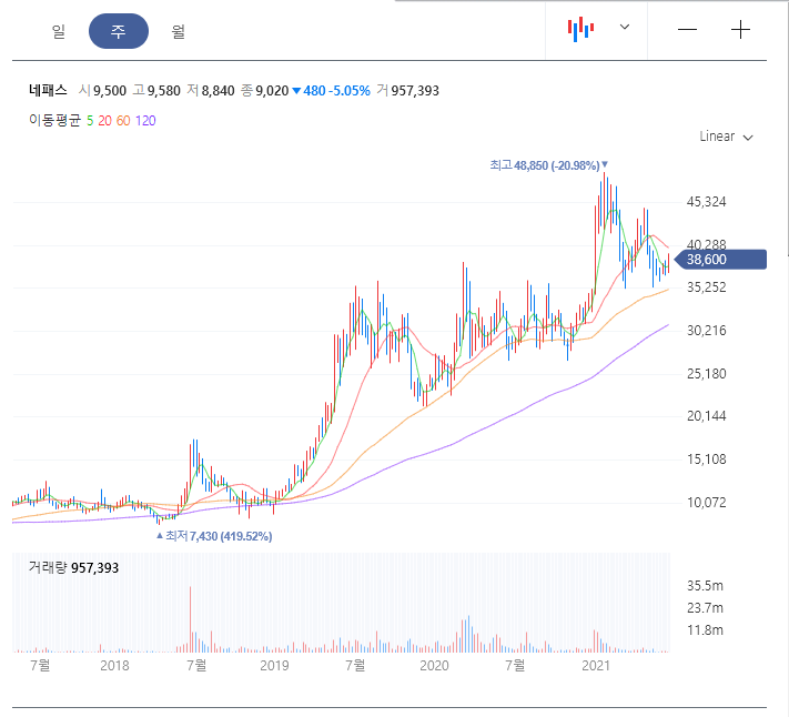 반도체 후공정 회사 네패스 주가 전망 분석 중 2018년도엔 7000원인 주식이었는데, 주가에 상승을 통하여 48,850원 까지 상승했다가 최근에 조정되어 횡보 구간으로 돌입한 것 같습니다. 최근 반도체 주식들이 횡보 구간이 길어지고 있습니다. (개인적으론 매수하고 있음.)