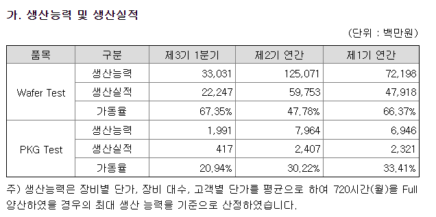 생산가동률입니다. Wafer test는 1분기에 비해 생산능력이 70프로 정도 상승하였습니다. 20년도엔 생산능력은 상승하였지만, 실적은 19년도와 비슷합니다. 21년 1분기 생산실적은 20년에 비해 상승 하였습니다. 향후 투자에 참고하시길 바랍니다.