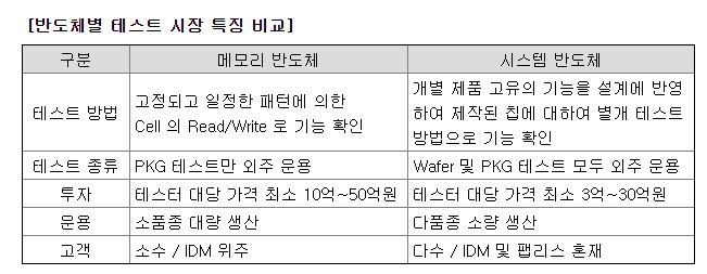 반도체 테스트 시장은 메모리 반도체와 시스템 반도체의 구분에 따라 요구되는 스펙이나 특성이 상이한 편입니다. 메모리 반도체의 경우 표준화된 제품으로 대량생산을 위한 목적이 뚜렷하기 때문에 동시에 많은 수량의 테스트가 가능한 장비 개발 및 생산방법 위주로 발전되어 온 반면 시스템 반도체는 다품종의 제품에 대한 다양한 방법의 테스트를 요구하기 때문에 동일 장비로 얼마나 많은 종류의 칩을 테스트할 수 있는지에 대한 역량이 더 중요하게 여겨집니다. 시스템 반도체 테스트 장비는 메모리 반도체 테스트 장비에 비하여 상대적으로 낮은 가격이지만 테스트 되는 제품의 종류 및 특성에 따라 테스트 장비의 종류가 세분화되어 있습니다. 따라서 시스템 반도체의 경우 다양한 종류의 제품에 대응이 가능한 테스트 장비의 구축과 이를 운용할 수 있는 전문 엔지니어의 확보, 운용 노하우가 매우 중요한 경쟁력으로 대규모의 투자와 더불어 테스트 엔지니어의 육성 및 확보가 선행되어야 합니다.